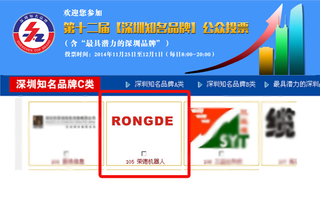 2014年,深圳市荣德机器人科技有限公司作为国家级高新技术企业,广东省名牌产品,成功入选第十二届“深圳知名品牌”评选活动,并定于2014年11月25日至12月1日(每天8:00-20:00)进行公众投票,投票结果直接决定公司是否被评选上。所以特请各位朋友帮忙荣德公司投上一票。谢谢!投票具体规则如下:
