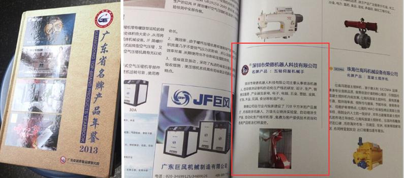 近日由广东卓越质量品牌研究院出版的《2013广东省名牌产品年鉴》,深圳市荣德机器人科技有限公司赫然在目。