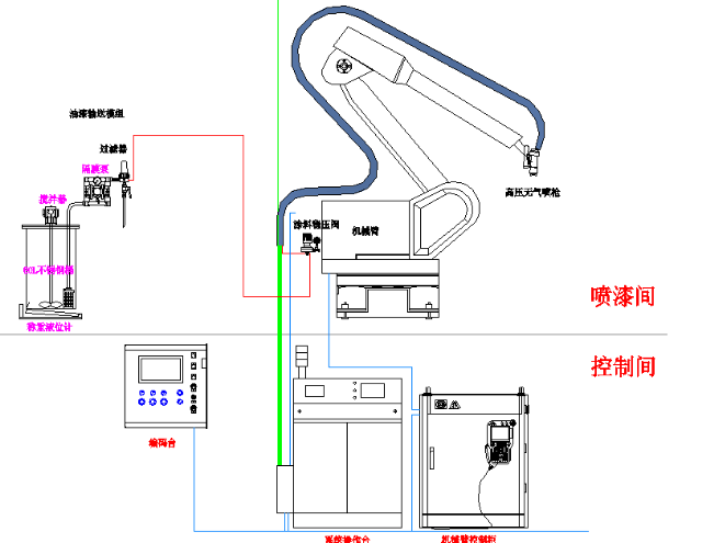 喷漆工位采用机械臂自动喷涂加人工补漆,其中人工补漆面积不能大于5%,应保证线上能同时自动喷底漆和自动喷面漆,不允许采用更换油漆管道分不同时段喷底漆或面漆。自动喷涂工位主要配置由喷涂机器人(防爆型,且具有示教功能)、供漆系统(高压无气供漆泵及管路,油漆调漆桶,储漆桶,气动搅拌器等)、高压无气自动喷枪、人工补漆系统及控制系统等组成。