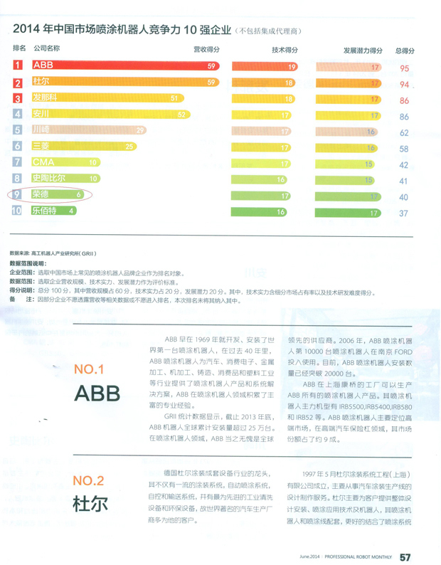 日前,国内某权威机器人产业杂志对2014年中国市场喷涂机器人的核心市场竞争力进行了深入了解并根据各企业营收、技术、发展潜力三项重要指标进行评分,并得出最终排名,荣德公司在所有入围的十家企业里面排名第九,排名前八名的均为国外巨头,荣德公司在中国国内的排名中处于第一名的领先地位,这也符合荣德公司“中国喷涂机器人领先品牌”的战略地位。