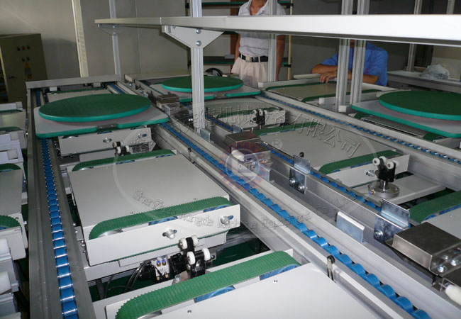 主输送链定位升降台:在主链和支链衔接位置设置升降台对工装托盘进行顶升托举,在各关联工序对工装托盘进行精定位。工装托盘定位采用1圆形销、1菱形销进行定位。升降台减速机速度可通过变频器进行设定;焊接线布置4台升降台,第一段线体用两台升降台,第二段线体单独用两台升降台,除第一台外,其他三台需要设计定位机构来对工装板进行定位和在上下两层都需要推送气缸,使工装板能快速进出升降台。加工的话要求输送过程中托盘移动平稳,工件在输送过程无晃动。能做到重复定位精准,上下料顺畅无爬行现象