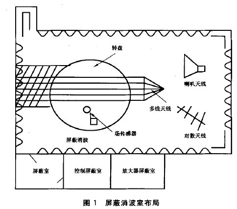 为 了 测 试操作者的安全,操作者必须被?;て鹄幢苊馐艿绞匝槌∷母咂岛透咔慷鹊绱懦〉纳撕?。即便是在人员稀少的乡村,开阔场地是可以接受的,但若受法律限制,至少需要一个屏蔽室。由 屏 蔽 室改造的,具有部分隔衬的屏蔽室,是使用一定数量的能吸收射频(RF)的材料来抑制无隔衬屏蔽室的主谐波。假如能建立一个均匀场,进行的辐射抗扰性测试就可得到承认。另 一 方 面,考虑到机器人的尺寸,在对机器人进行辐射抗扰性测试期间,要达到一个较好的均匀场,推荐使用屏蔽消波室。即使局部隔衬的屏蔽室没有消波室那么宽敞。图 1 给 出了一个适合进行机器人 EMC测试的屏蔽消波室的布局。除消波室之外,在机器人辐射抗扰性测试期间,一些邻近的屏蔽室通常用于放置与机器人相关的测试仪器和设备。另 外 ,使 用适当的天线(即多股的传输线)和采用适当的测试设备可改善电磁场的均匀性。