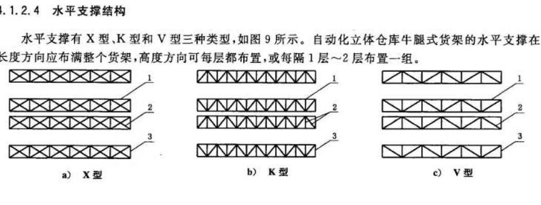 垂直支撑有X型刚性、X型柔性和Z型刚性三种类型,自动化立体仓库牛腿式货架的垂直支撑在长度方向应布满整个货架
